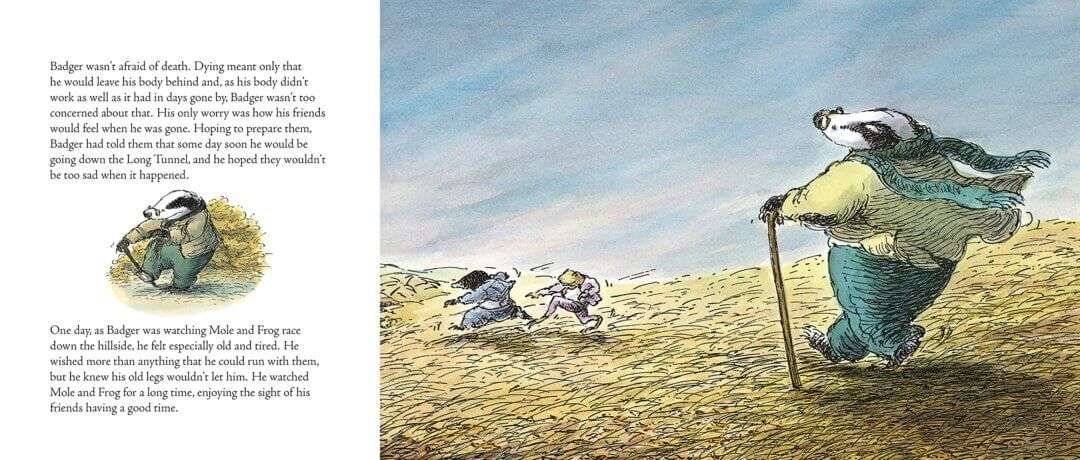 “Badger’s Parting Gifts” by Susan Varley is a wonderful book for very young children (infant to 5 years old).